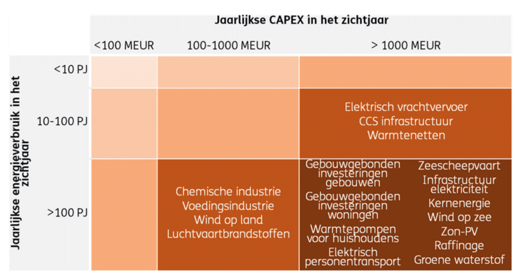 | > 100 PJ | Chemische industrie, Voedingsindustrie, Wind op land, Luchtvaartbrandstoffen | Gebouwgebonden investeringen gebouwen, Gebouwgebonden investeringen woningen, Warmtepompen huishoudens, Elektrisch personentransport, Zeescheepvaart, Infrastructuur elektriciteit, Kernenergie, Wind op zee, Zon-PV, Raffinage, Groene waterstof | ||