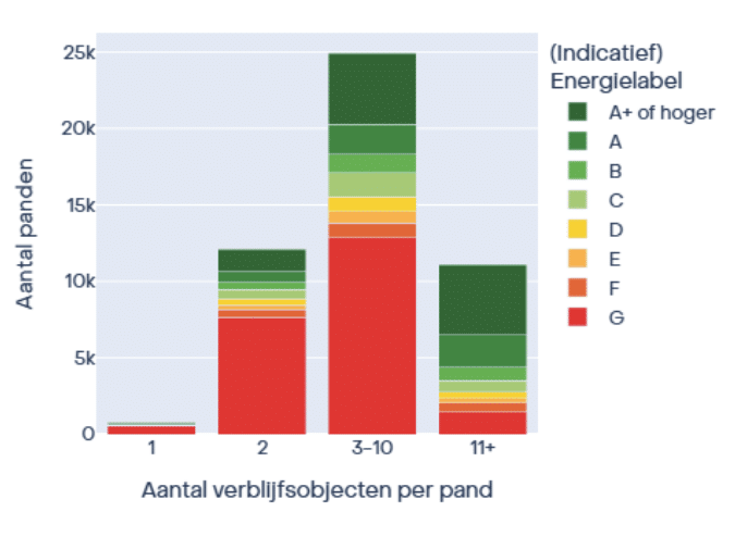 Binnen deze dataset is gekeken naar de gebouwen die op basis van energielabels of bouwjaar mogelijk gerenoveerd moeten worden. Ongeveer de helft van de gebouwen in deze dataset heeft minstens een indicatief label C. Indicatief label betekent hierbij dat er bij gebrek aan een gemeten label is uitgegaan van het bouwjaar als indicatie. Het leeuwendeel van de gebouwen met slechtere labels, in totaal 25 duizend, zijn kleinere en vaak oudere gebouwen in binnensteden, bijvoorbeeld winkels met bovenwoningen.