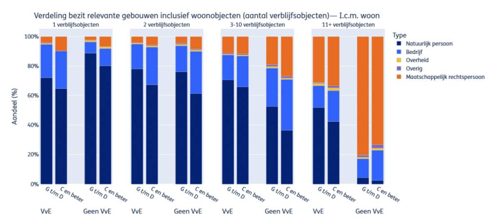 In het bezit valt op dat het aandeel natuurlijke rechtspersonen – privébezitters – hoger is bij gebouwen met minder verblijfsobjecten, gebouwen met slechtere labels, en gebouwen met VvE. Ter vergelijking zijn ook de gebouwen zonder VvE in de analyse meegenomen. Daarbij valt op dat het overgrote merendeel van de grotere gebouwen in bezit is van woningcorporaties. Ook waar VvE’s zijn opgericht, zijn stichtingen, verenigingen of coöperaties relatief vaak betrokken: naar verwachting deels doordat de utiliteitsfuncties hier onderwijs en zorg kunnen betreffen en deels door ‘gespikkeld bezit’, waarbij woningcorporaties een deel van hun bezit hebben verkocht.