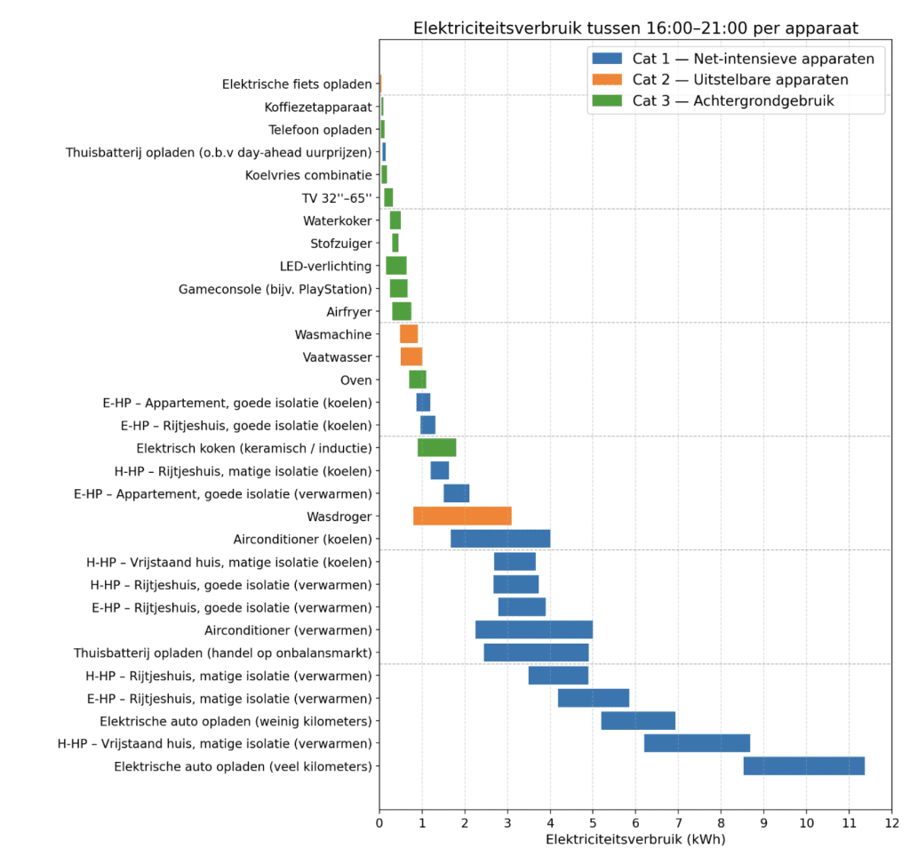 Duidelijk is dat het laden van elektrische auto’s en warmtepompen de grootste elektriciteitsverbruikers zijn. Het verbruik is sterk afhankelijk van het dagelijks gebruik van de auto. Het elektriciteitsverbruik wordt geschat op 5,2 – 6,9 kWh voor mensen die niet zoveel rijden tot 8,5 – 11,4 kWh voor mensen die meer rijden. Omdat de accu van een elektrische auto binnen enkele uren volledig is opgeladen, is het laden van elektrische auto’s in verreweg de meeste gevallen zonder problemen uit te stellen tot na de piekuren.